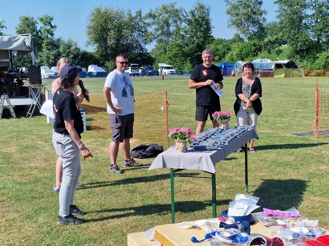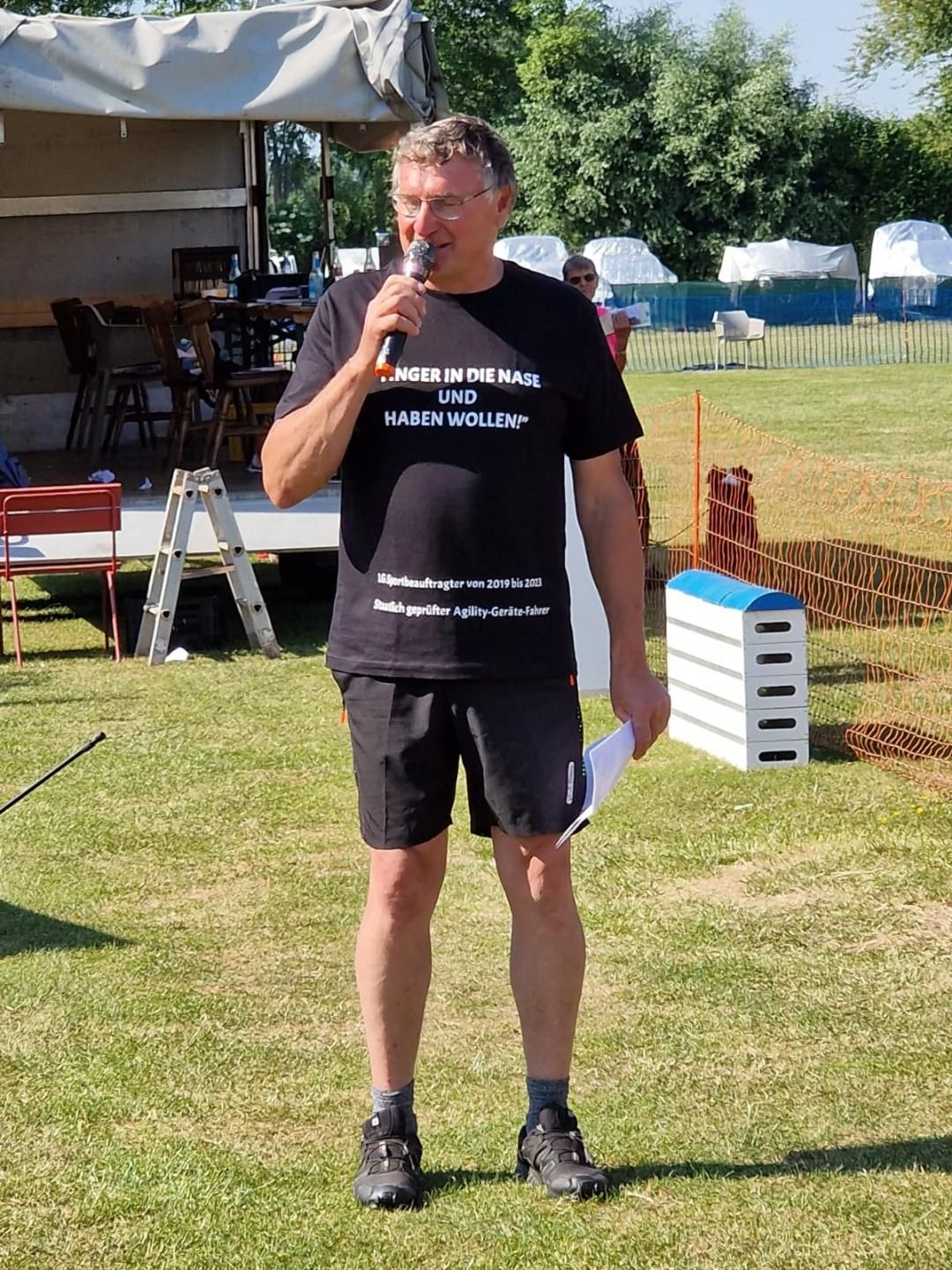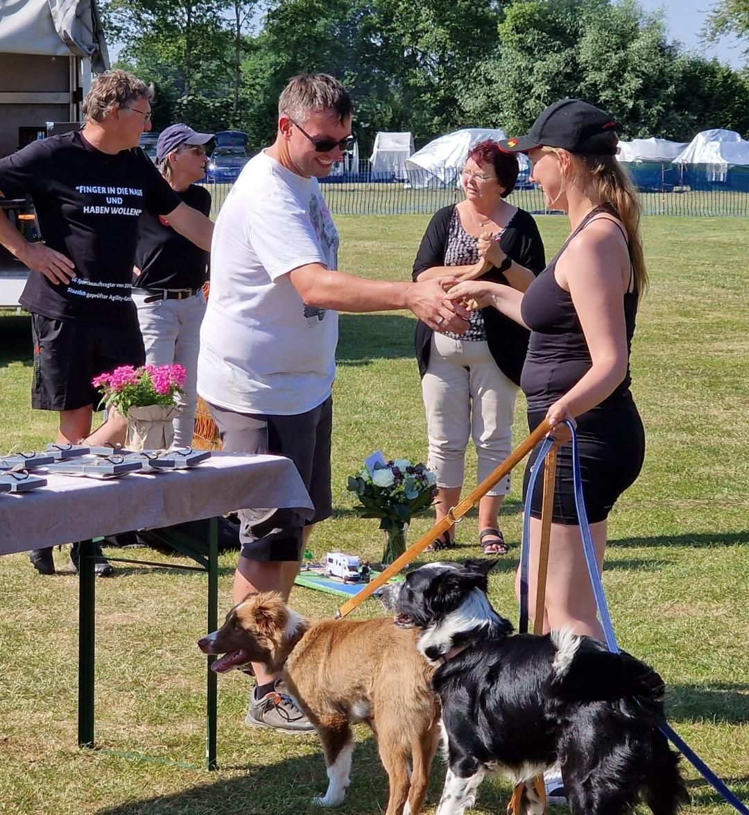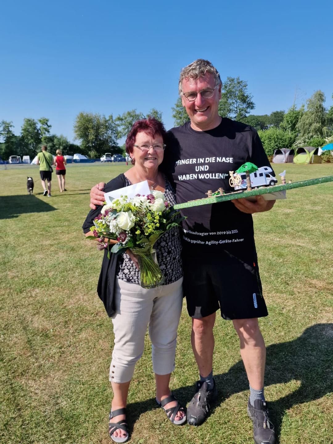 Während des Turniers wurde auch Josef, der vergangene Sportbeauftragte des Vereins, gebührend verabschiedet. Seine vier Jahre Einsatz und Hingabe für den Hundesport wurden mit einem persönlich gestalteten T-Shirt gewürdigt, das seine Persönlichkeit symbolisierte. Zudem erhielt er einen Gutschein für eine wohlverdiente Auszeit gemeinsam mit seiner Ehefrau! Seine Ehefrau Ute, die ihn stets unterstützte, wurde mit einem Blumenstrauß geehrt und für ihre Unterstützung während Josefs Amtszeit gedankt.